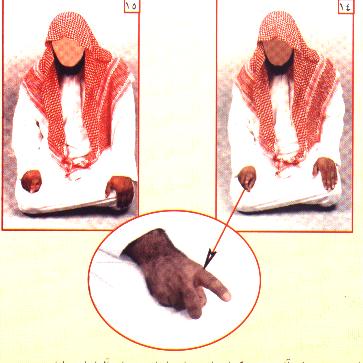 وتكون هيئة يده اليمنى كما في الصورة : يقبض أصبعه الخنصر والبنصر ويُحلق الإبهام